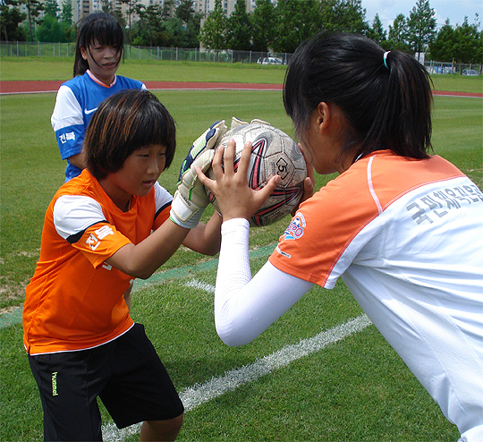 전북 KSPO(국민체육진흥공단) 여자축구단(감독 강재순) 골키퍼 김현주(22)가 삼례중앙초(감독 홍성필) 진희단(5학년)의 자세를 바로잡는다. 전주 온고을 여성축구단 강미애(37)가 옆에서 이를 유심히 바라본다.