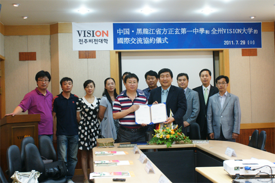 팡정제1중학 황진차이 교장과 맹판전 부교장 등 6명은 이날 전주비전대학을 방문, 중국 학교 안에 비전한국문화센터를 개설하고, 흑룡강성 중·고교 학생들에게 한국어 교육과 한국 문화를 알리는 등에 두 학교가 협력한다는 내용을 담은 협약서에 서명했다.