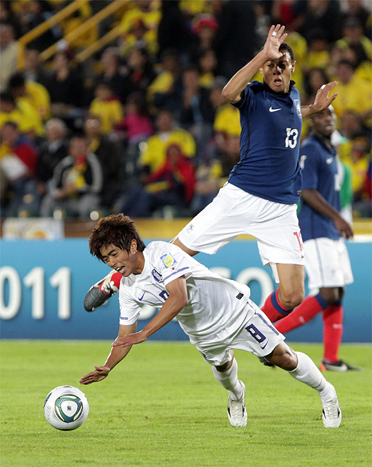 3일 오전(한국시각) 콜롬비아 보고타 에스타디오 엘 캄핀 경기장에서 열린 국제축구연맹(FIFA) U-20 월드컵 조별리그 2차전 한국과 프랑스 경기에서 백성동이 프랑스 수비의 반칙을 당하며 넘어지고 있다.
