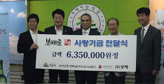 전북지역 대표 향토기업인 ㈜보배는 7일 '보배로' 소주 병뚜껑 1개당 100원씩을 적립하며 그동안 모은 2300여만원을 소외계층 기부금으로 도내 각 지자체에게 전달했다고 밝혔다.