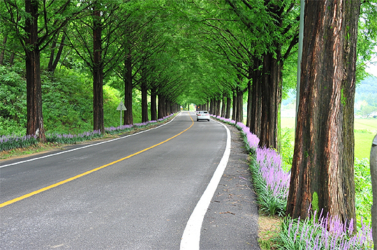 특히 이 길은 왕복 12km 구간에 거쳐 메타세쿼이아와 그 아래 위치한 맥문동 꽃이 함께 어우려 더욱 장관을 이루고 있다.