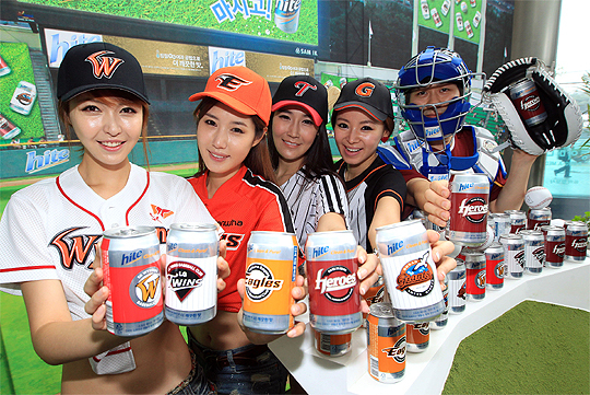 하이트맥주가 프로야구 5개 구단(넥센 히어로즈, 롯데 자이언츠, SK 와이번스, LG 트윈스, 한화 이글스 )과 함께 디자인한 '하이트 프로야구 스페셜캔'을 선보였다. 구단 별 제품은 해당 구단의 홈 경기장 등에서 구입 가능하다. 17일 서울 세종로에서 열린 출시행사에서 모델들이 하이트맥주 프로야구 스페셜캔을 소개하고 있다.