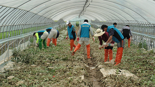 직원들은 수박재배농가에 부족한 일손을 보태어 하우스 10동, 2000여평의 침수된 농작물을 제거하며 복구 활동에 구슬땀을 흘렸다.