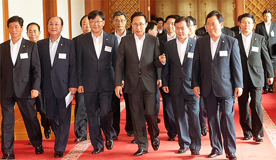 이명박 대통령이 30일 오후 청와대로 허재안 의장단 회장, 허광태 서울시 의회의장 등 시ㆍ도의회 의장단을 초청, 환담을 나눈 후 오찬장으로 이동하고 있다.