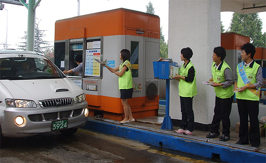 김제시청 공무원들이 고속도로 나들목에서 귀성객들을 상대로 지평선축제를 홍보 하고 있다. (desk@jjan.kr)