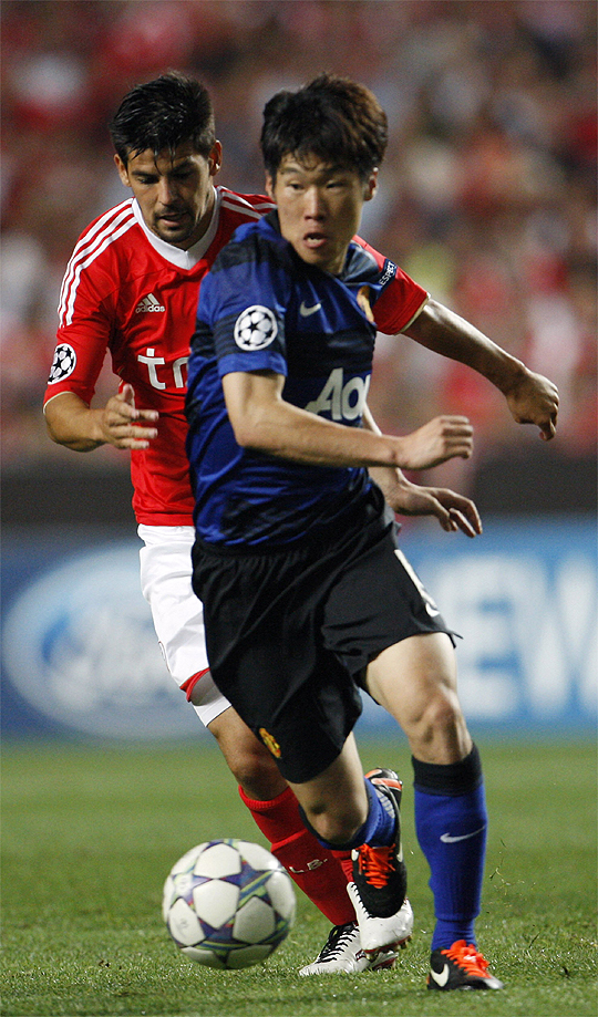맨체스터 유나이티드의 박지성이 14일(현지시각) 포루투갈 리스본에서 열린 유럽축구연맹(UEFA)챔피언스리그 벤피카와의 경기에서 상대팀 선수 가이탄과 볼을 다투고 있다.