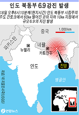 미국 지질조사국(USGS)에 따르면 규모 6.9의 지진은 이날 오후 6시10분께 네팔, 부탄, 티베트와 인접한 인도 시킴 주(州)의 주도 강토크에서 60㎞ 떨어진 곳의 지하 19.7㎞ 지점에서 일어났다.