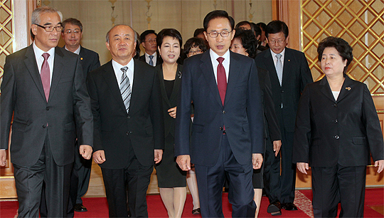 이명박 대통령이 19일 오전 청와대에서 류우익 통일부장관 등 5개부처 장관들에게 임명장을 수여한 후 환담장으로 향하고 있다. 앞줄 왼쪽부터 최광식 문화체육관광부장관,류우익 통일부장관, 이 대통령, 김금래 여성가족부장관.