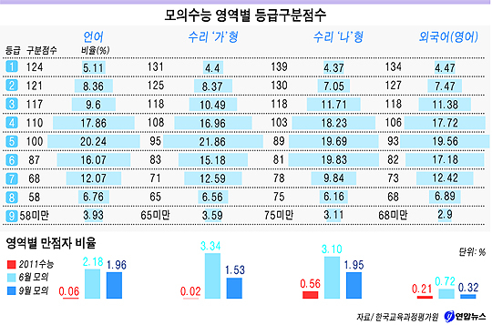 이 비율은 영역별 만점자가 언어 2.18%, 수리 '가' 3.34%, 수리 '나' 3.10%, 외국어 0.72%나 됐던 6월 모의수능보다는 수리 영역을 중심으로 상당히 줄었다. 지나치게 쉬웠던 6월 모의수능보다는 9월 모의수능이 약간 어려웠던 것을 보여준다.