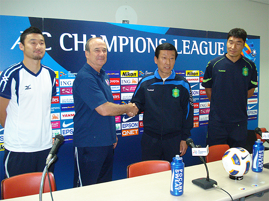 '마지막 승부'를 하루 앞둔 26일. 양 팀 감독은 선수 1명씩 대동한 채 '전장'(戰場)인 전주월드컵경기장에서 기자 회견을 열었다. 세레소 오사카는 레비 쿨피 감독(58)과 수비수 모니와 테루유키(30)가, 전북은 최강희 감독(52)과 공격수 정성훈(32)이 나왔다.