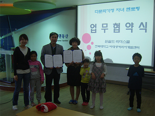 전주 원월드리더스쿨(이사장 나춘균)은 27일 전주지역의 다문화가정 아이들의 교육 지원 및 복지서비스 제공을 위해 전북대학교 여대생커리어개발센터(센터장 김은희 교수)와 업무 협약식을 체결했다.