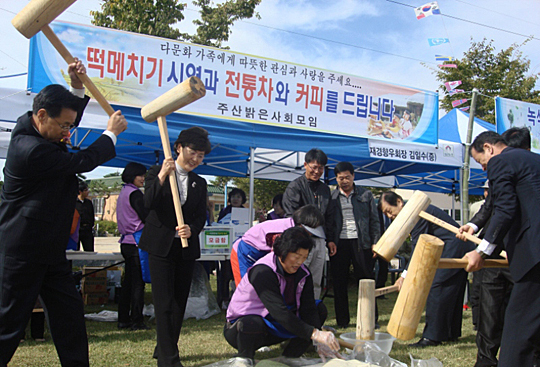 3일 부안 주산면민의 날 떡메치기 시연행사를 하며 주민들이 즐거워하고 있다. (desk@jjan.kr)