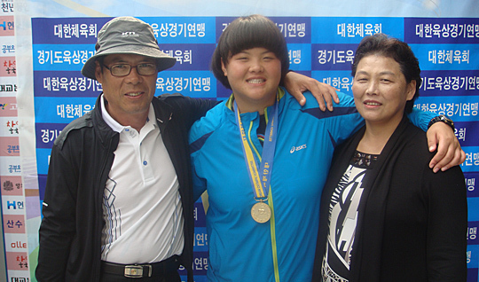 10일 경기도 고양종합운동장 육상경기장에서 열린 '제92회 전국체육대회' 여고부 포환던지기에서 금메달을 딴 이미나(이리공고 1학년·가운데)가 아버지 이영훈 씨(52·왼쪽)와 어머니 강예순(53)와 나란히 기념 촬영을 하고 있다. 김준희(goodpen@jjan.kr)