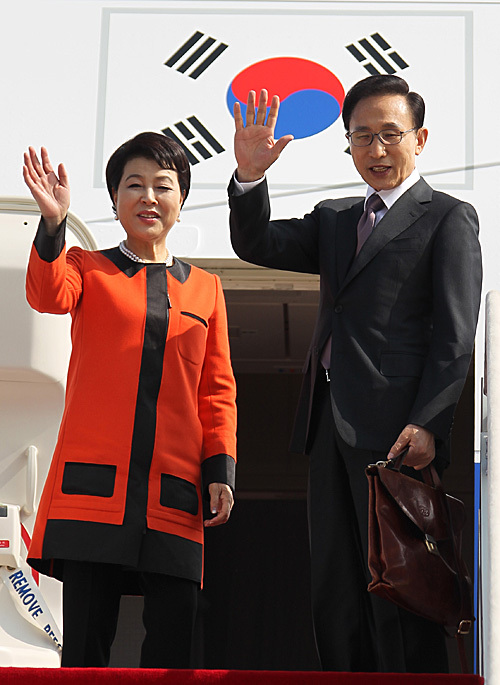 미국을 국빈 방문하는 이명박 대통령과 부인 김윤옥 여사가 11일 경기 성남 서울공항에서 전용기에 올라 손흔들어 인사하고 있다.