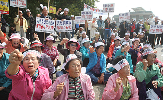 완주군 용진면 주민들이 용진주유소 옆 도로에서 송전 철탑 설치 노선 변경을 요구하는 집회를 갖고 있다.