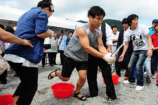 지난 고창수산물축제 참가자들이 풍천장어 잡기 체험을 하며 즐거워 하고 있다. (desk@jjan.kr)