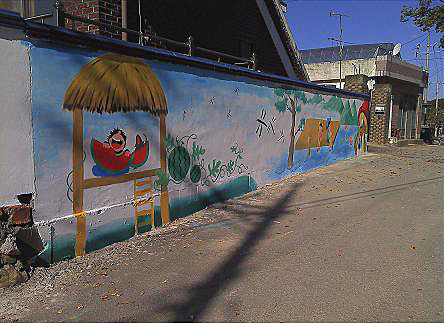 그런 노온마을이 달라지고 있다. 연초 그린빌리지사업으로 마을 입구쪽에 꽃길을 조성하고 회관주변을 정리하는가 싶더니, 지난 9월에는 농어촌희망재단에서 실시하는 마을공동체지원사업 공모에 선정되어 마을 벽화그리기 사업을 실시했다. 특히, 이번 벽화그리기 사업을 시작할 때 주민들과의 수차례 공동회의를 거쳐 작성한 사업계획이 우수성을 인정받아 당초 지원예정 사업비보다 400만원을 증액한 1400만원을 지원받았다.
