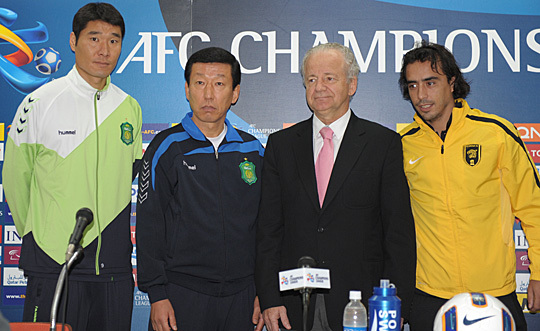 25일 전북현대와 사우디의 알 이티하드는 2011 AFC 챔피언스리그 4강 2차전을 앞두고 기자회견을 가졌다. 왼쪽부터 정성훈 선수, 최강희 감독, 다비도비치 감독, 파울로 선수 전북현대(desk@jjan.kr)