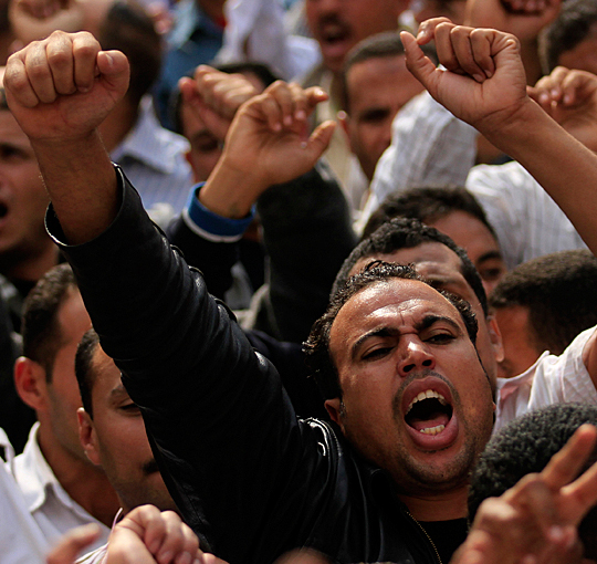 이집트 경찰관들이 25일(현지시간) 임금 인상과 구 정권 출신 고위직 해임을 요구하며 카이로의 내무부 청사 앞에서 시위를 벌이고 있다.