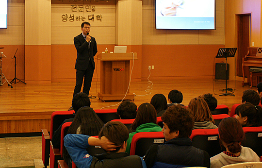 전주비전대학(총장 홍순직) 창업보육센터는 26일 이 대학 강당에서 재학생 200여 명이 참석한 가운데 '예스(Yes) 리더 기업가 정신' 특강을 마련했다.