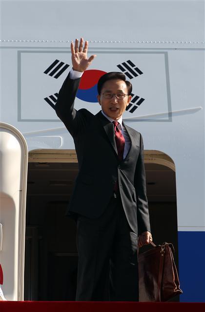 ▲ 이명박 대통령이 1일 경기 성남 서울공항에서 러시아로 출국하기 전 손을 흔들어 인사하고 있다. 연합뉴스
