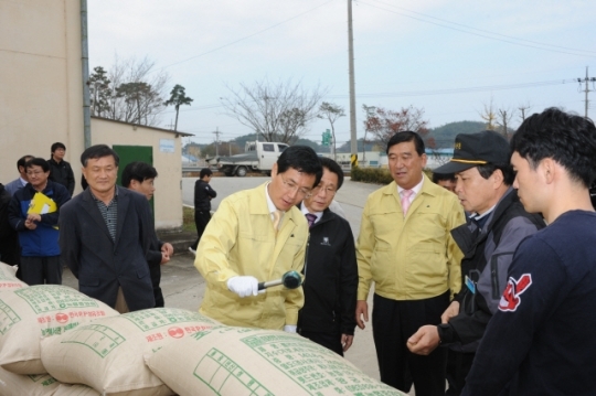 ▲ 이환주 남원시장이 건조벼수매 현장을 방문, 농민들을 격려하고 있다.