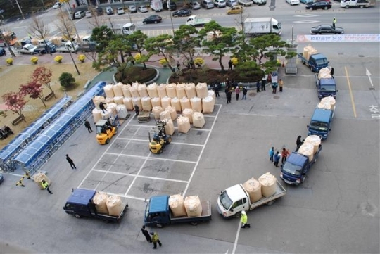 전국농민회총연맹(전농) 익산지부도 9일 익산시청 광장에 약200톤의 벼를 야적하며 시위를 벌였다.