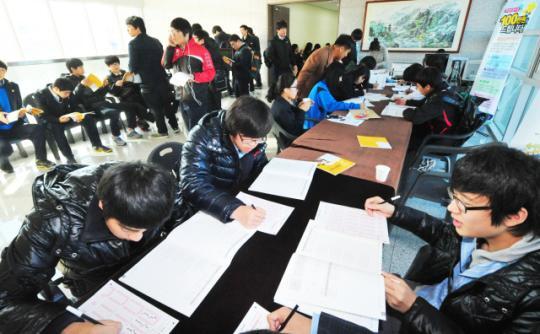▲ 도내 특성화고 채용박람회...24일 전북지방중소기업청에서 열린 ‘2011 전북 특성화고 채용박람회’에서 특성화고 학생들이 직업 선호도 검사를 받고 있다. 추성수기자 chss78@