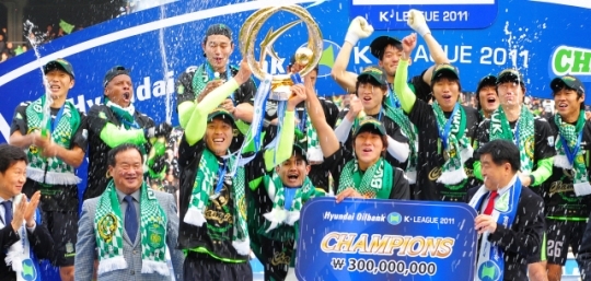 ▲  4일 전주월드컵경기장에서 열린 프로축구 K리그 2011 챔피언결정전에서 승리한 전북현대 선수들이 우승 트로피를 들고 환호하고 있다. 안봉주기자 bjahn@