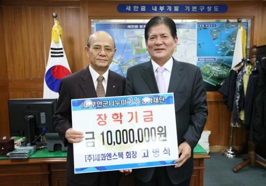 부안 하서면 백련마을 출신의 ㈜세화엔스텍 고병석 회장이 지난 7일 부안군청을 찾아 고향의 인재양성을 위해 부안군 나누미근농장학재단에 장학기금 1000만원을 기탁했다.