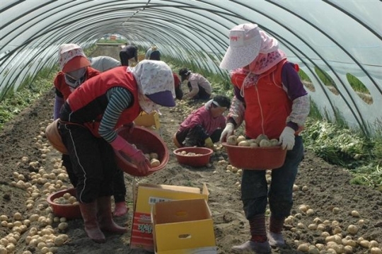 김제시 진봉면 지평선들녘에는 논 소득 다양화사업 일환으로 가을감자를 재배 하고 있는 하얀 비닐하우스가 여기저기 설치돼 있는 가운데 요즘 가을감자 수확이 한창이다.