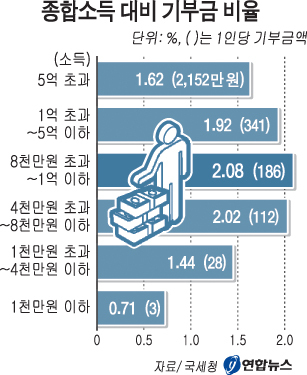 1억 초과~5억 이하 소득자의 기부금 비율은 소득액의 1.92%(1인당 341만원), 5억 초과 소득자는 1.62%(2천152만원)였다.