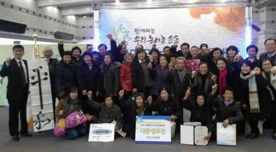 ▲ '제 1회 대한민국 농어촌 마을대상'에서 대통령상을 받은 임실치즈마을 주민들이 수상을 자축하며 기념촬영을 하고 있다.