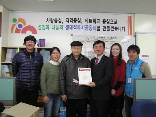 ▲ 한자자격검정 2급에 합격한 김마철 옹(가운데)이 부안종합사회복지관 직원들과 함께 합격서를 들어 보이고 있다.