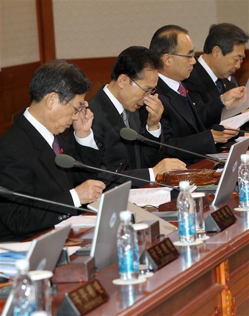 ▲ 이명박 대통령과 김황식 총리가 27일 청와대에서 열린 제55회 국무회의에서 동시에 안경을 만지고 있다. 연합뉴스