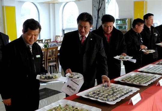 ▲ 지난 26일 임실치즈테마파크 치즈캐슬관에서 열린 신제품개발 보고회에서 참석자들이 시식을 하고 있다.