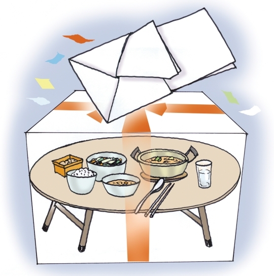 맛있는 냄새 때문인지 뱃속이 요란스러워요. 이불을 걷어 내고 밥상 앞에 앉았어요. 상 위에 곱게 접은 쪽지가 놓여 있어요.