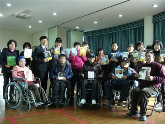 부안 장애인자조모임인 '오뚜기' 회원들이 부안장애인종합복지관에 베스트셀러 12권을 기증한 뒤 기념촬영을 하고 있다.