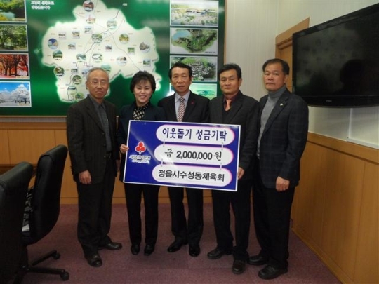 지난달 24일 정읍시 수성동체육회 신현철 회장과 장병윤 감사, 이연님 재무는 정읍시청을 방문해 불우이웃 돕기 성금 200만원을 정읍시에 기탁했다. 신현철 회장은 "지난해 호우 피해 주민들에게 써달라"고 말했다.