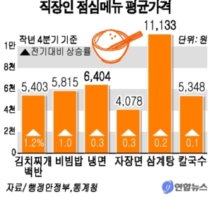 2일 행정안전부와 통계청이 공동으로 조사한 작년 12월 주요 서민생활물가에 따르면 충북에서 김치찌개 백반이 5714원으로 9월에 비해 285원(5.2%) 오르는 등 외식비가 상승해 직장인들의 점심값 부담이 커졌다.
