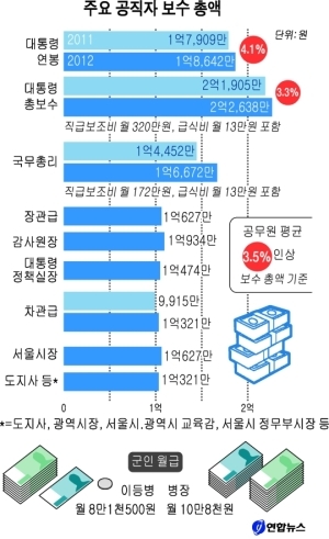 대통령 연봉은 1억7909만원에서 4.1% 오른 1억8642만원이 된다. 여기에 연봉과 별도로 월 320만원씩 지급되는 직급보조비와 월 13만원의 급식비를 더하면 총 보수는 2억1905만원에서 2억2638만원으로 3.3% 오른다.