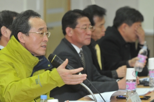 ▲ 3일 전주 조촌동 주민센터에서 열린 전주친환경첨단복합산업단지 3-1단계 조성사업 토지소유자 및 관계자 합동간담회에서 송하진 전주시장이 탄소산단 조성에 대해 설명하고 있다. 추성수기자 chss78@