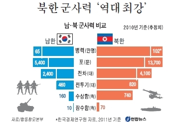 2011년 현재 북한은 102만명에 이르는 육군을 비롯해 탱크, 방공포, 군함 등이 역대 최대규모이다. 전투기 수는 1986년보다 적지만 1990년대 이후 최신예 미그 29기가 도입됐던 점을 고려하면 공군력도 최고 수준이고 특히 잠수함의 증강을 주목해야 한다고 보고서는 강조했다.