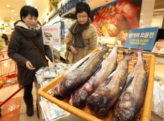 8일 롯데마트 서울역점을 찾은 주부들이 시중보다 56%(1마리 1100원) 정도 저렴한 가격에 판매되는 동태를 고르고 있다. 롯데마트는 설을 앞두고 농립수산식품부에서 물가안정을 위해 비축한 동태를 중간 유통단계 없이 바로 공급해 저렴하게 판매하고 있으며 600g 내외 1인 2마리 한정 판매된다. 연합뉴스