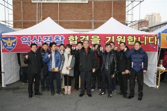 익산경찰이 7일 전주 동암고에서 실시된 '2012년도 경찰공무원 정기 승진시험'에서 뜨거운 동료애를 발휘하고 했다.조용식 서장을 비롯한 각 부서별 간부급 10여명은 승진시험에 나선 소속 경찰관의 손을 일일이 잡아주고 선전을 기원하는 파이팅을 외치는 등 훈훈한 동료애를 과시했다.