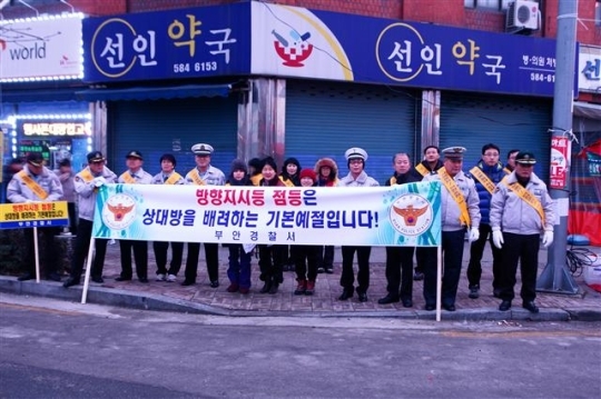 부안경찰서 정병권 서장 등 직원 24명을 비롯해 전·의경어머니회, 녹색어머니회 등 협력단체 회원 50명은 9일 부안읍 봉덕리 터미널사거리에서 '방향지시등 점등 준수하기'캠페인에 나섰다.