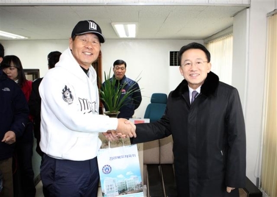고양원더스팀을 이끌고 전주야구장에서 전지훈련중인 김성근 감독은 10일 선수단 격려차 방문한 김완주 지사와 만난 자리에서 이같은 입장을 밝혔다.