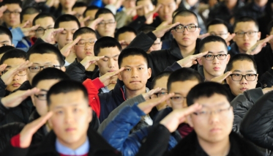35사단 새해 첫 입영행사가 10일 신병교육대대 충경교육관에서 열린 가운데 머리를 짧게 자른 훈련병들이 경례를 하고 있다.