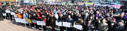 이날 광장에는 매서운 추위에도 불구 400여명의 인파가 찾아 토지주들의 '통 큰 결단'을 촉구하며 성명서 발표에 이어 탄소섬유 공장 설립의 당위성을 외치는 구호제창을 벌였다.