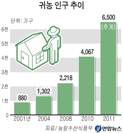 11일 농림수산식품부가 도별 귀농인구를 예비집계한 결과를 보면 작년 귀농 가구 수는 6천500가구에 달하는 것으로 추계됐다. 2010년 4천67가구보다 무려 60% 증가한 규모다.